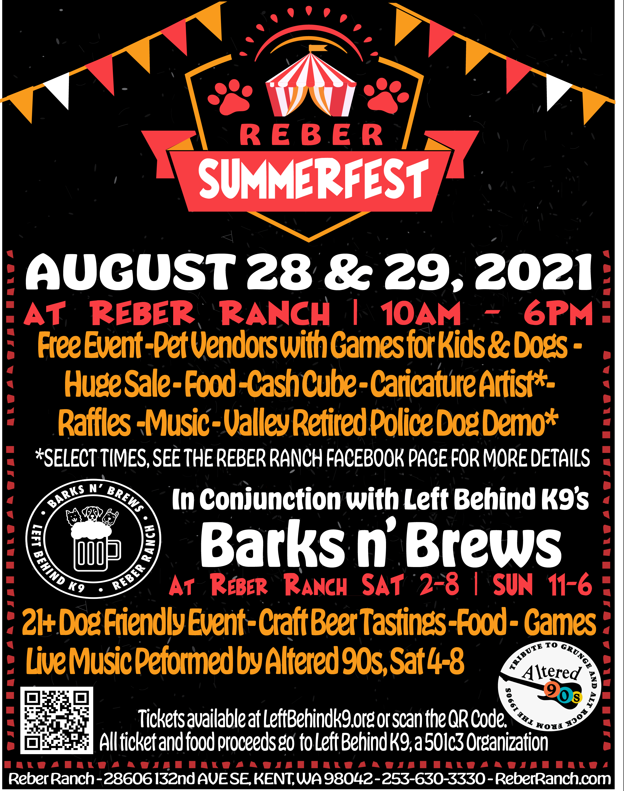This event is in conjunction with Left Behind K9’s Barks n’ Brews at Reber Ranch, Saturday, August 28th 2-8pm and Sunday, August 29th 12-6pm! This is a separate ticketed event, 21+ that is a dog-friendly beer garden atmosphere with craft beer tastings, music, food for purchase and games! Each ticket comes with 7 craft beer tastings tokens and a commemorative glass. Plus, on Saturday night from 4-8, Altered 90’s will be performing live music in the Bark n’ Brews Beer Garden! Tickets are on-sale now for this event if you purchase before July 31st with the code EARLYBIRD, tickets are only $25 and you get a free $5 food voucher! Tickets are available here:Â